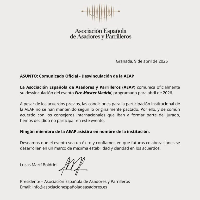 La Asociación Española de Asadores y Parrilleros (AEAP) ha decidido desvincularse formalmente del evento Fire Master Madrid tras cambios en los términos acordados inicialmente.