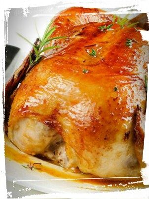 Acomodamos el pollo en una bandeja que no sea muy grande, pero que la pieza entre cómodamente. Horneamos 70/75 minutos por lado. A la mitad de la cocción añadimos a la bandeja el liquido sobrante del remojo de las frutas, una de champagne y otra copa igual de agua. Con ese liquido iremos bañando cada tanto el pollo.